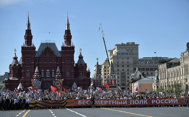 В московском шествии по Тверской к Красной площади прошел и президент России Владимир Путин. Вместе с ним в колонне шли премьер-министр Израиля Биньямин Нетаньяху и президент Сербии Александр Вучич, присутствовавшие на торжествах Дня Победы в Москве.