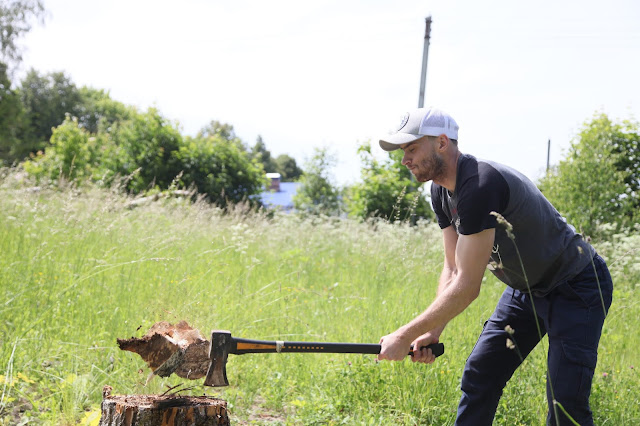 «Сегодня солнечная и теплая погода, что конечно помогает нам трудится в таком светлом и духовном месте. Последний раз я колол дрова в деревне, когда был маленький, но опыт остался, что помогло быстро приноровиться и выполнить все поставленные задачи», – радостно рассказывает сотрудник кинокомпании «Союз Маринс Групп» Евсей Перминов.